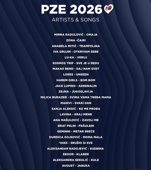 Serbia revealed the names of the 24 songs participating in Pesma - The Sebian preseletion for ESC 2026. In Pesma there will be 2 semifinals and 1 Grand Final. Pesma 's winner is going to represent Serbia in coming ESC 2026. Hence the list of the 24 songs participating in Pesma 2026: